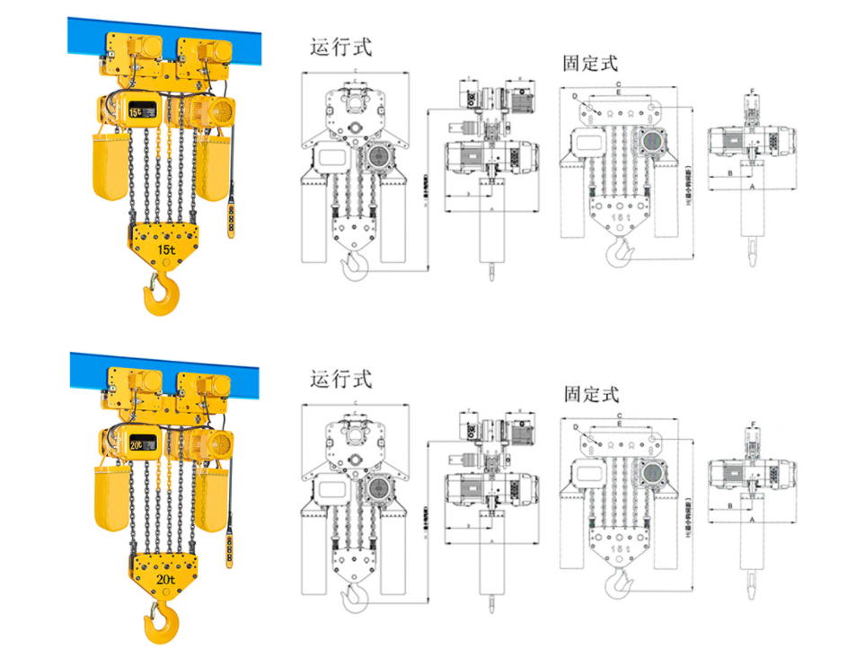 | 運(yùn)行式環(huán)鏈電動(dòng)葫蘆(7.5T-50T)尺寸參數(shù): | ||||||||